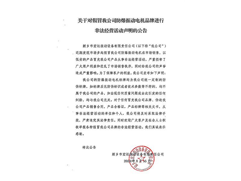 關于對假冒我公司防爆振動電機品牌進行非法經營活動聲明的公告